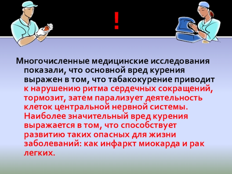 Многочисленные медицинские исследования показали, что основной вред курения выражен в том,