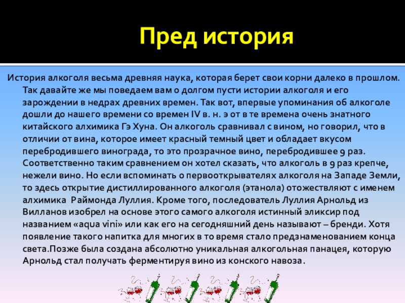 свои корни далеко в прошлом. Так давайте же мы поведаем вам о долгом пусти истории алкоголя и его зарождении в недрах древних времен. Так вот, впервые упоминания об алкоголе дошли до нашего времени со времен IV в. н. э от в те времена очень знатного китайского алхимика Гэ Хуна. Он алкоголь сравнивал с вином, но говорил, что в отличии от вина, которое имеет красный темный цвет и обладает вкусом перебродившего винограда, то это прозрачное вино, перебродившее 9 раз. Соответственно таким сравнением он хотел сказать, что алкоголь в 9 раз крепче, нежели вино. Но если вспоминать о первооткрывателях алкоголя на Западе Земли, то здесь открытие дистиллированного алкоголя (этанола) отожествляют с именем алхимика Раймонда Луллия. Кроме того, последователь Луллия Арнольд из Вилланов изобрел на основе этого самого алкоголя истинный эликсир под названием «aqua vini» или как его на сегодняшний день называют – бренди. Хотя появление такого напитка для многих в то время стало предзнаменованием конца света.Позже была создана абсолютно уникальная алкогольная панацея, которую Арнольд стал получать ферментируя вино из конского навоза.