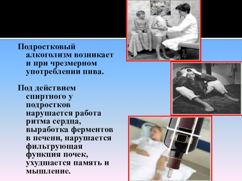 Слайд 28Подростковый алкоголизм возникает и при чрезмерном употреблении пива.