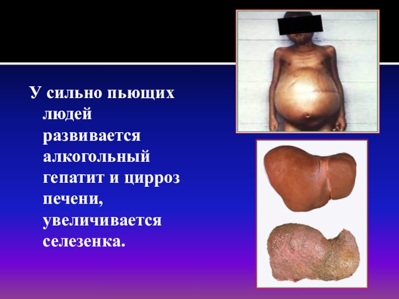 Слайд 26У сильно пьющих людей развивается алкогольный гепатит и цирроз печени, увеличивается