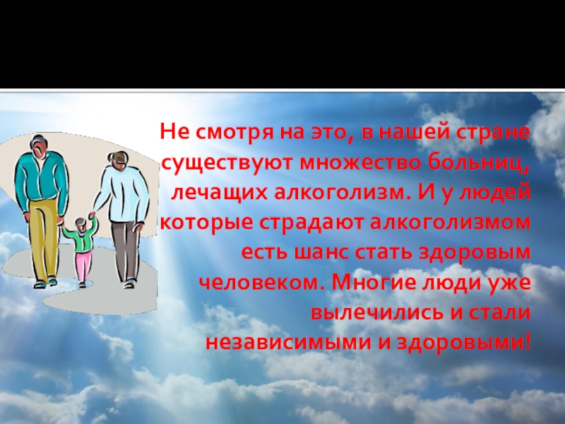 алкоголизм. И у людей которые страдают алкоголизмом есть шанс стать здоровым человеком. Многие люди уже вылечились и стали независимыми и здоровыми!