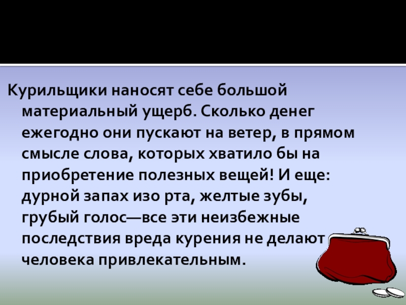 на ветер, в прямом смысле слова, которых хватило бы на приобретение полезных вещей! И еще: дурной запах изо рта, желтые зубы, грубый голос—все эти неизбежные последствия вреда курения не делают человека привлекательным.