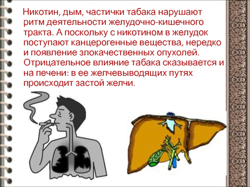 Слайд 36 Никотин, дым, частички табака нарушают ритм деятельности желудочно-кишечного тракта.