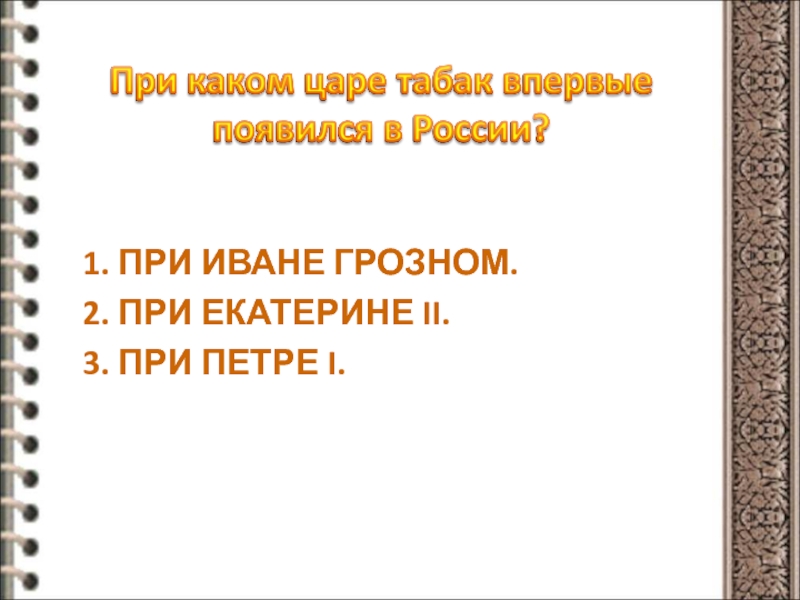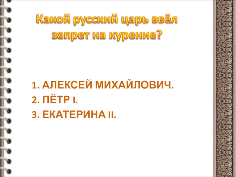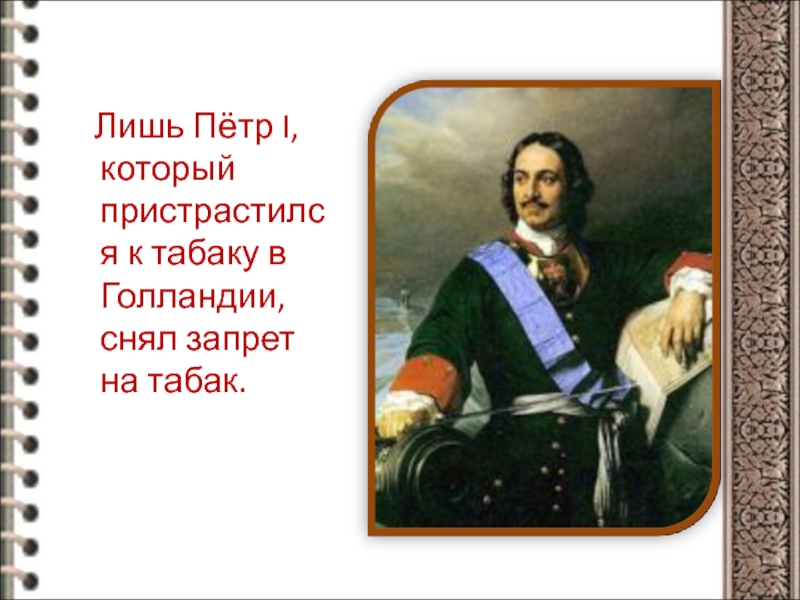Слайд 14 Лишь Пётр I, который пристрастился к табаку в Голландии,