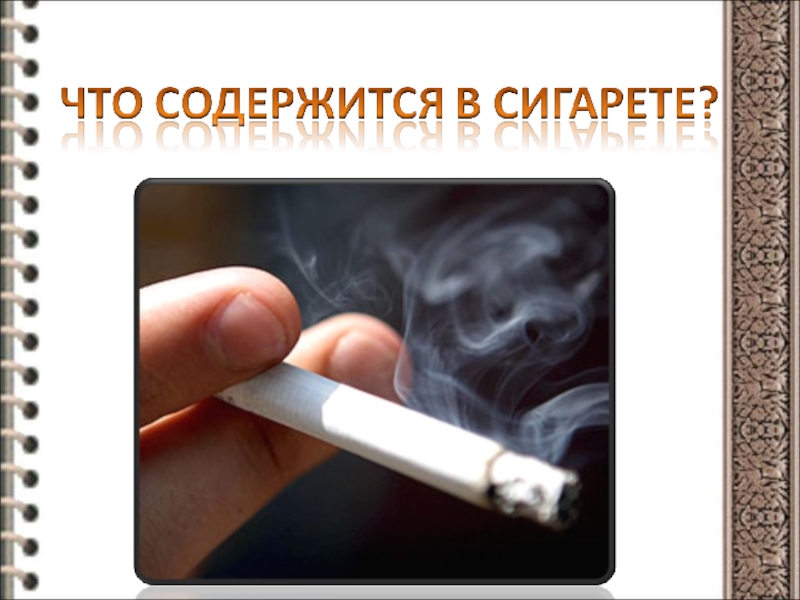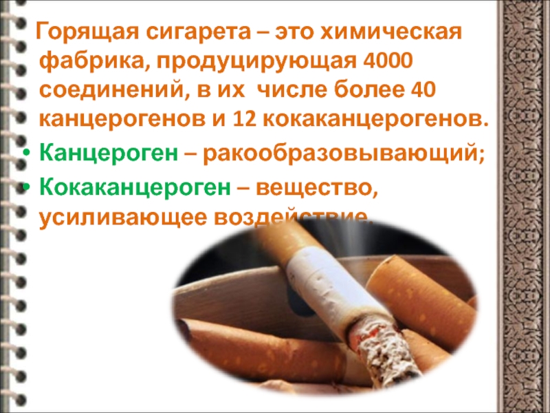 Слайд 3 Горящая сигарета – это химическая фабрика, продуцирующая 4000 соединений,