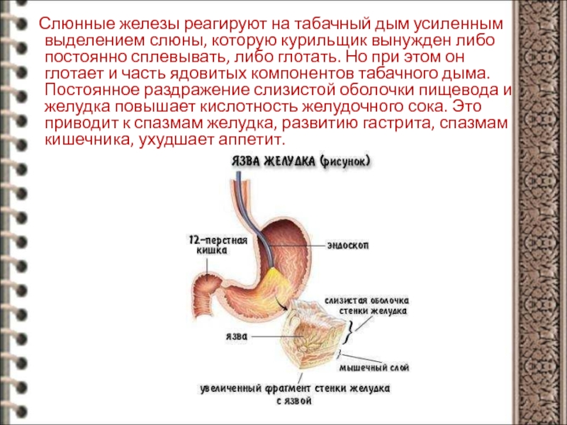 которую курильщик вынужден либо постоянно сплевывать, либо глотать. Но при этом он глотает и часть ядовитых компонентов табачного дыма. Постоянное раздражение слизистой оболочки пищевода и желудка повышает кислотность желудочного сока. Это приводит к спазмам желудка, развитию гастрита, спазмам кишечника, ухудшает аппетит.