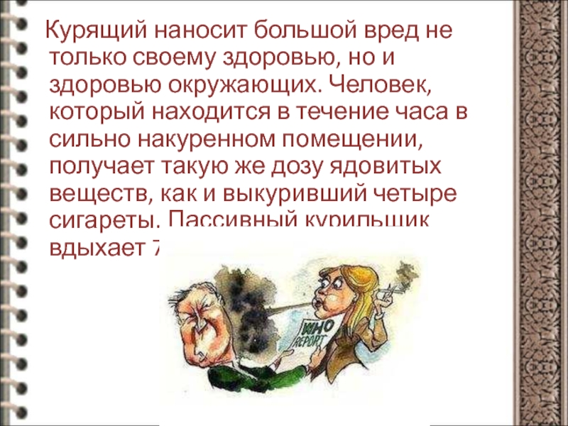 и здоровью окружающих. Человек, который находится в течение часа в сильно накуренном помещении, получает такую же дозу ядовитых веществ, как и выкуривший четыре сигареты. Пассивный курильщик вдыхает 70 % гадостей.