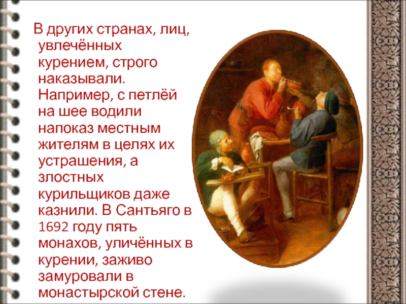 Слайд 10 В других странах, лиц, увлечённых курением, строго наказывали. Например,