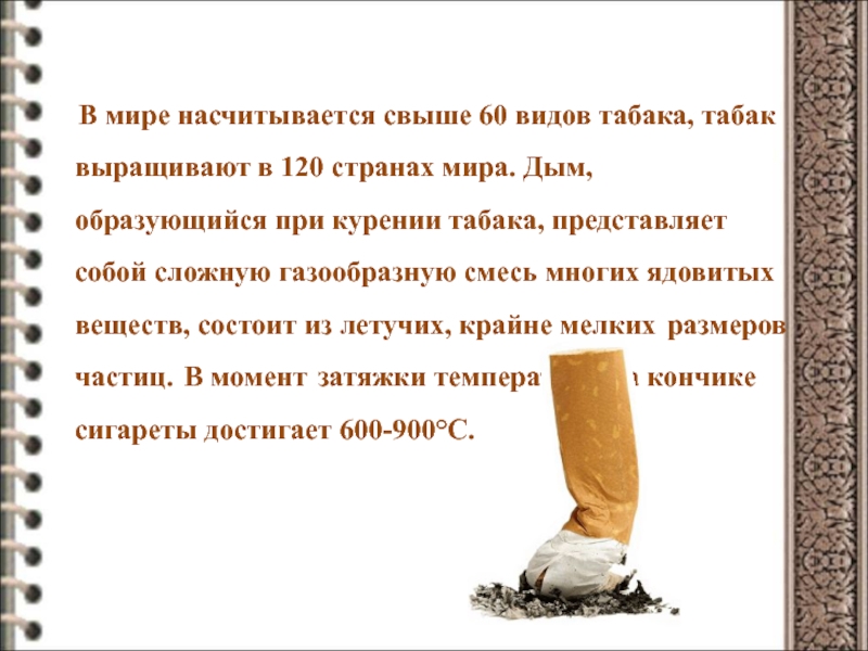 видов табака, табак выращивают в 120 странах мира. Дым, образующийся при курении табака, представляет собой сложную газообразную смесь многих ядовитых веществ, состоит из летучих, крайне мелких размеров частиц. В момент затяжки температура на кончике сигареты достигает 600-900°С.