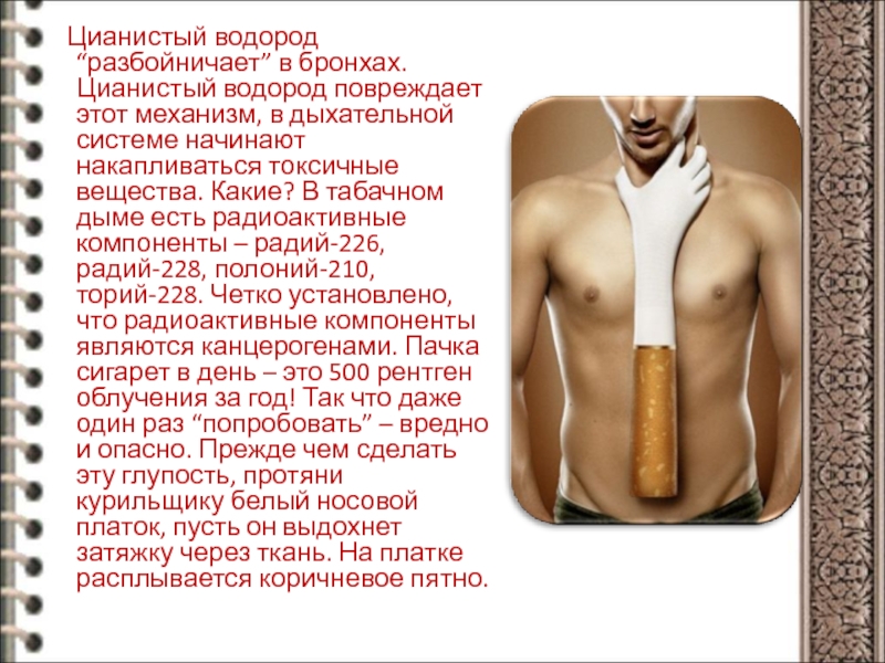 механизм, в дыхательной системе начинают накапливаться токсичные вещества. Какие? В табачном дыме есть радиоактивные компоненты – радий-226, радий-228, полоний-210, торий-228. Четко установлено, что радиоактивные компоненты являются канцерогенами. Пачка сигарет в день – это 500 рентген облучения за год! Так что даже один раз “попробовать” – вредно и опасно. Прежде чем сделать эту глупость, протяни курильщику белый носовой платок, пусть он выдохнет затяжку через ткань. На платке расплывается коричневое пятно.