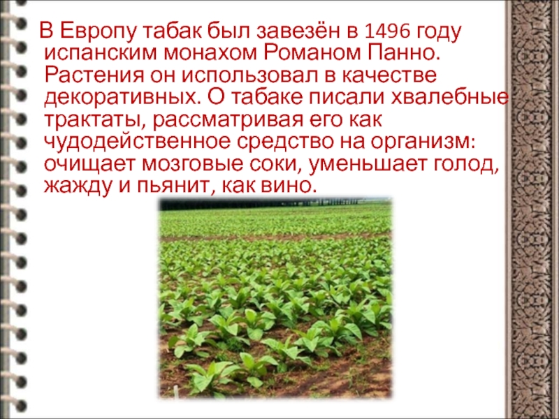 монахом Романом Панно. Растения он использовал в качестве декоративных. О табаке писали хвалебные трактаты, рассматривая его как чудодейственное средство на организм: очищает мозговые соки, уменьшает голод, жажду и пьянит, как вино.