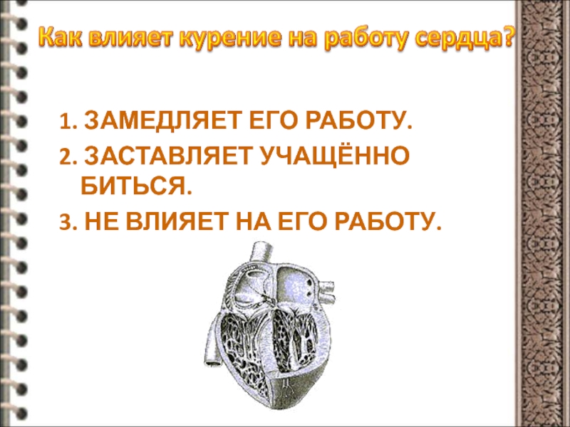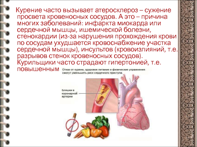 А это – причина многих заболеваний: инфаркта миокарда или сердечной мышцы, ишемической болезни, стенокардии (из-за нарушения прохождения крови по сосудам ухудшается кровоснабжение участка сердечной мышцы), инсультов (кровоизлияний, т.е. разрывов стенок кровеносных сосудов). Курильщики часто страдают гипертонией, т.е. повышенным давлением.