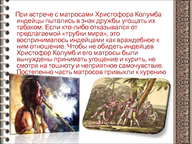 знак дружбы угощать их табаком. Если кто-либо отказывался от предлагаемой «трубки мира», это воспринималось индейцами как враждебное к ним отношение. Чтобы не обидеть индейцев Христофор Колумб и его матросы были вынуждены принимать угощение и курить, не смотря на тошноту и неприятное самочувствие. Постепенно часть матросов привыкли к курению табака.
