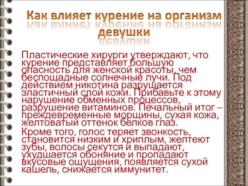 Слайд 45 Пластические хирурги утверждают, что курение представляет большую опасность для