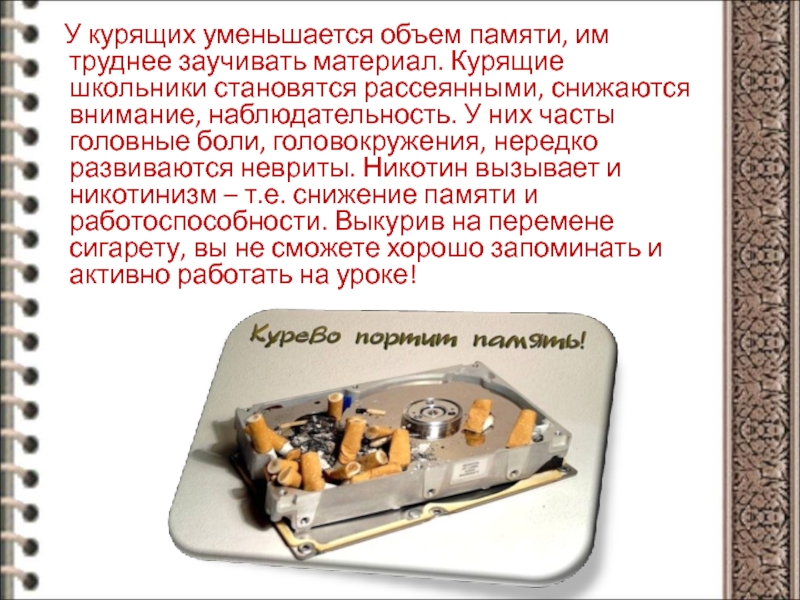 Слайд 33 У курящих уменьшается объем памяти, им труднее заучивать материал.