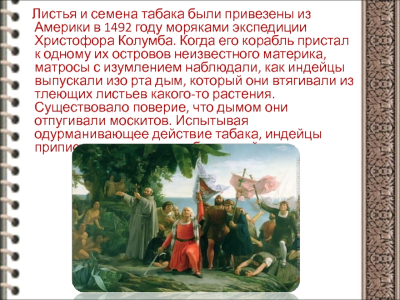 1492 году моряками экспедиции Христофора Колумба. Когда его корабль пристал к одному их островов неизвестного материка, матросы с изумлением наблюдали, как индейцы выпускали изо рта дым, который они втягивали из тлеющих листьев какого-то растения. Существовало поверие, что дымом они отпугивали москитов. Испытывая одурманивающее действие табака, индейцы приписывали ему волшебные свойства.