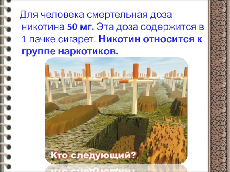 Слайд 21 Для человека смертельная доза никотина 50 мг. Эта доза