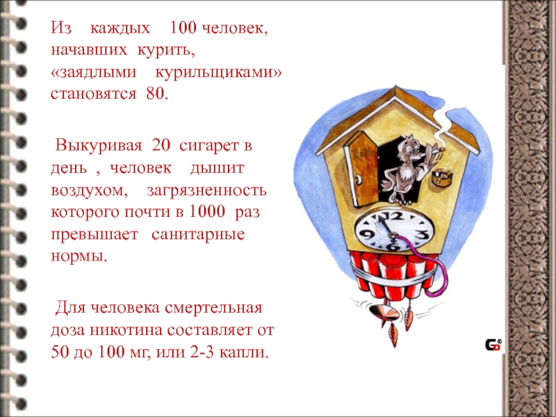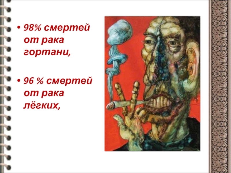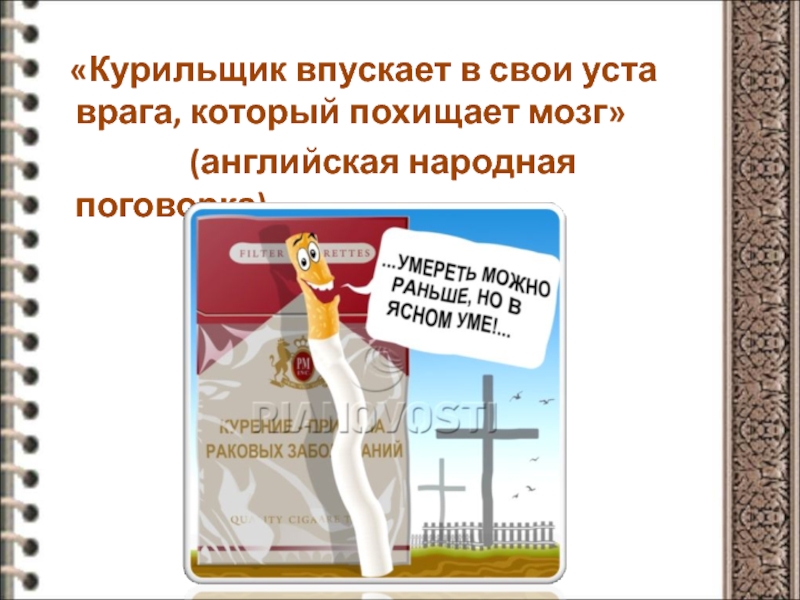 Слайд 2 «Курильщик впускает в свои уста врага, который похищает мозг»