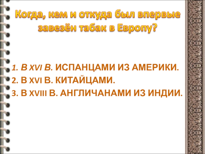 Слайд 6 Листья и семена табака были привезены из Америки в
