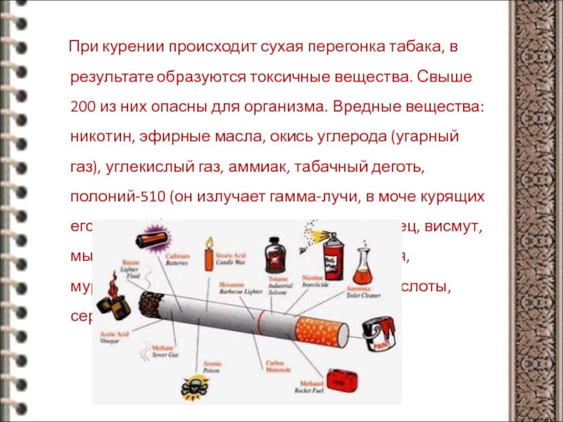 образуются токсичные вещества. Свыше 200 из них опасны для организма. Вредные вещества: никотин, эфирные масла, окись углерода (угарный газ), углекислый газ, аммиак, табачный деготь, полоний-510 (он излучает гамма-лучи, в моче курящих его в 6 раз больше, чем у некурящих), свинец, висмут, мышьяк, калин, а также масляная, уксусная, муравьиная, валериановая и синильная кислоты, сероводород, формальдегид и пр.