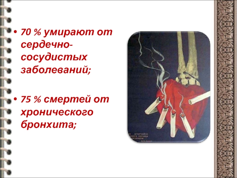 Слайд 5670 % умирают от сердечно-сосудистых заболеваний;