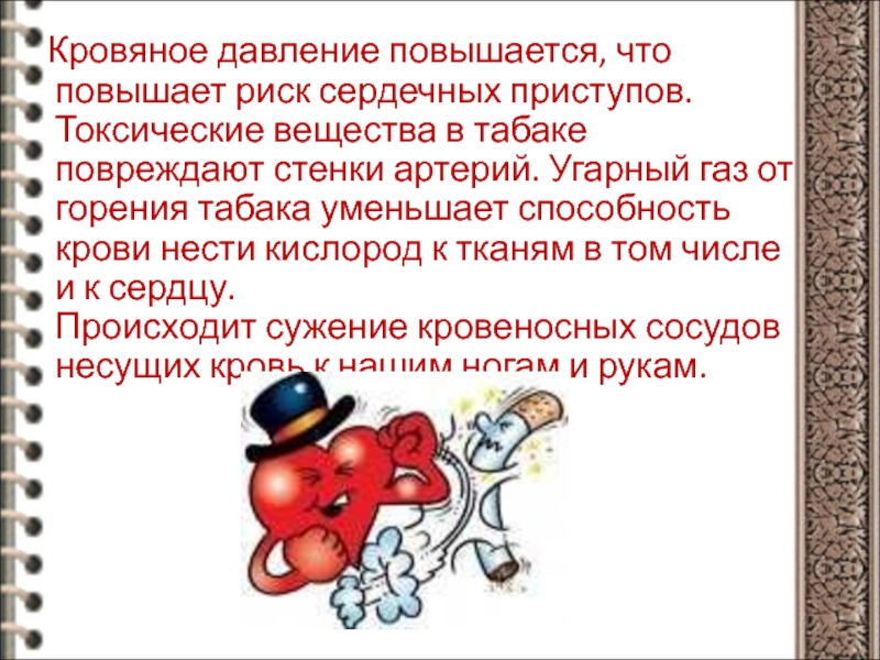 Слайд 23 Кровяное давление повышается, что повышает риск сердечных приступов. Токсические
