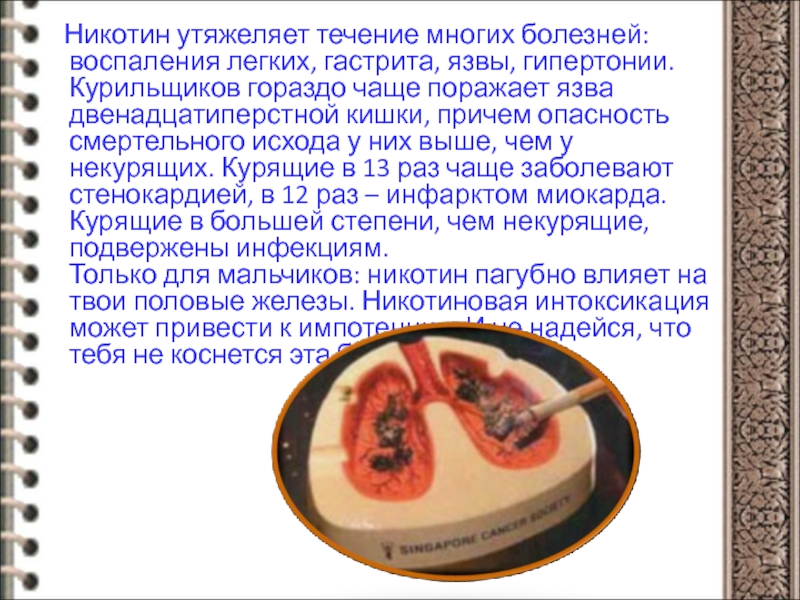 Слайд 20 Никотин утяжеляет течение многих болезней: воспаления легких, гастрита, язвы,