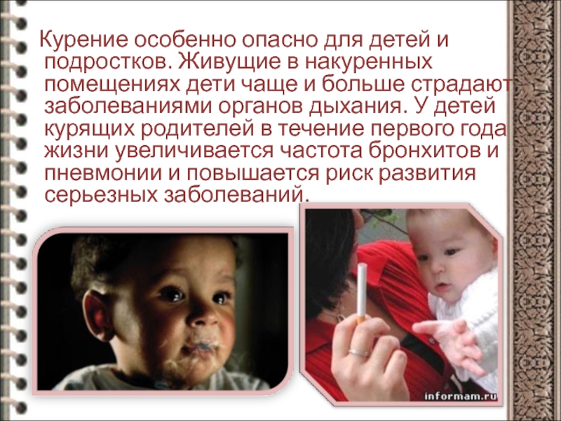 накуренных помещениях дети чаще и больше страдают заболеваниями органов дыхания. У детей курящих родителей в течение первого года жизни увеличивается частота бронхитов и пневмонии и повышается риск развития серьезных заболеваний.