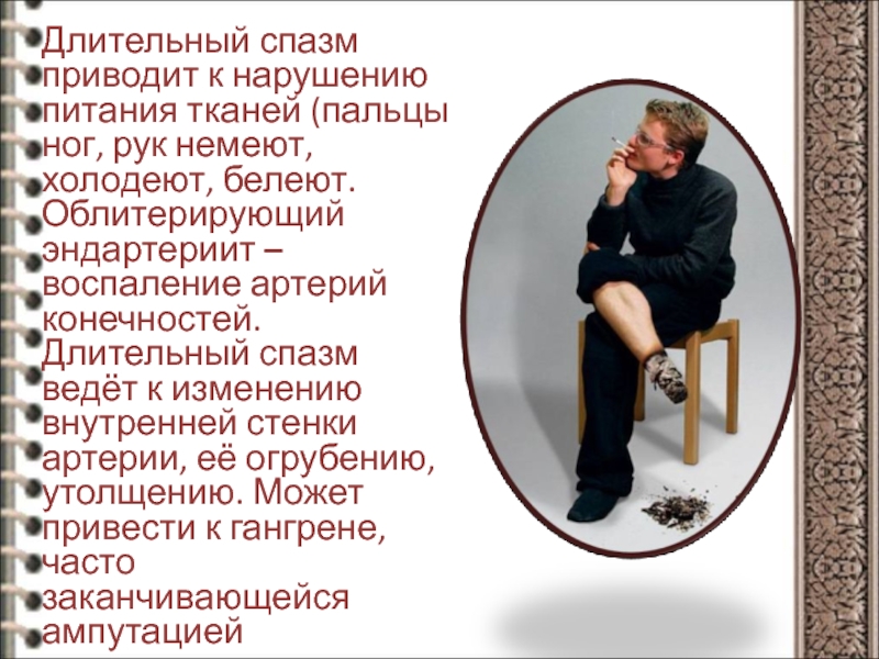 Слайд 37 Длительный спазм приводит к нарушению питания тканей (пальцы ног,