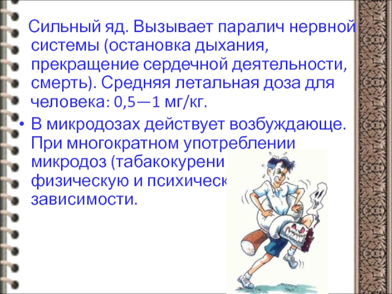Слайд 19 Сильный яд. Вызывает паралич нервной системы (остановка дыхания, прекращение