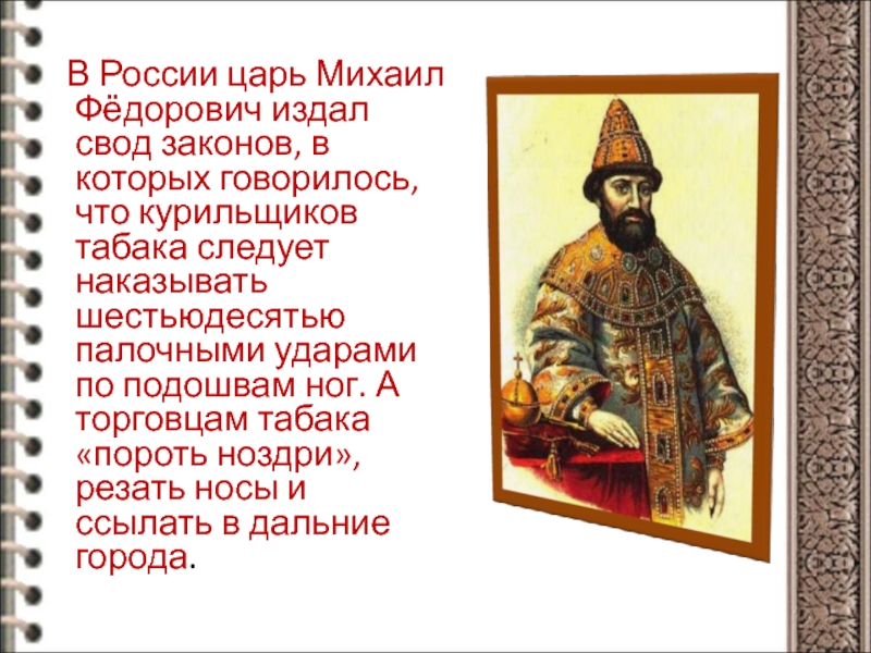 которых говорилось, что курильщиков табака следует наказывать шестьюдесятью палочными ударами по подошвам ног. А торговцам табака «пороть ноздри», резать носы и ссылать в дальние города.