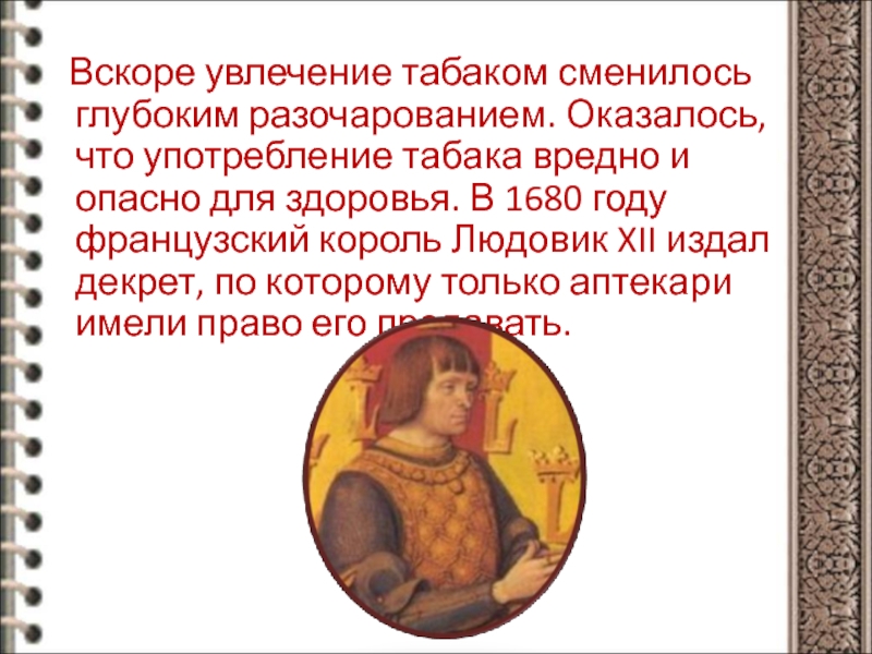 табака вредно и опасно для здоровья. В 1680 году французский король Людовик XII издал декрет, по которому только аптекари имели право его продавать.