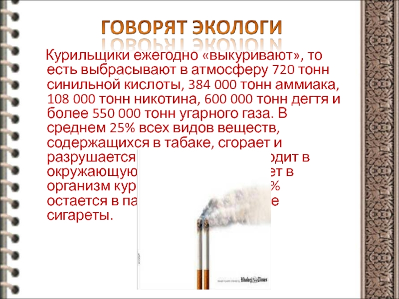 Слайд 54 Курильщики ежегодно «выкуривают», то есть выбрасывают в атмосферу 720