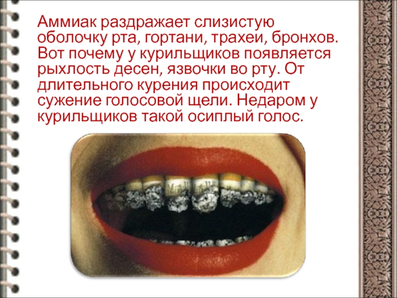 Слайд 25 Аммиак раздражает слизистую оболочку рта, гортани, трахеи, бронхов. Вот