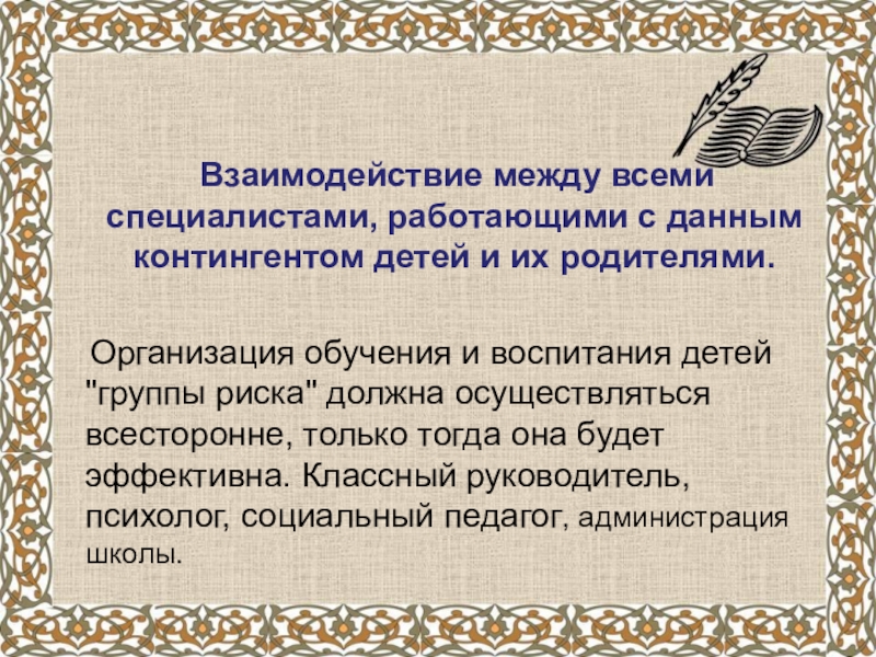 Организация обучения и воспитания детей "группы риска" должна осуществляться всесторонне, только тогда она будет эффективна. Классный руководитель, психолог, социальный педагог, администрация школы.