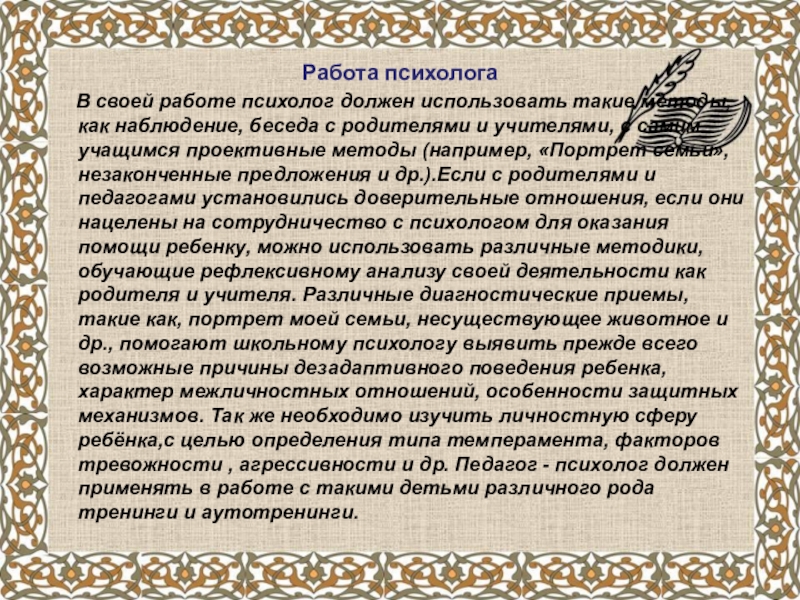 методы, как наблюдение, беседа с родителями и учителями, с самим учащимся проективные методы (например, «Портрет семьи», незаконченные предложения и др.).Если с родителями и педагогами установились доверительные отношения, если они нацелены на сотрудничество с психологом для оказания помощи ребенку, можно использовать различные методики, обучающие рефлексивному анализу своей деятельности как родителя и учителя. Различные диагностические приемы, такие как, портрет моей семьи, несуществующее животное и др., помогают школьному психологу выявить прежде всего возможные причины дезадаптивного поведения ребенка, характер межличностных отношений, особенности защитных механизмов. Так же необходимо изучить личностную сферу ребёнка,с целью определения типа темперамента, факторов тревожности , агрессивности и др. Педагог - психолог должен применять в работе с такими детьми различного рода тренинги и аутотренинги.