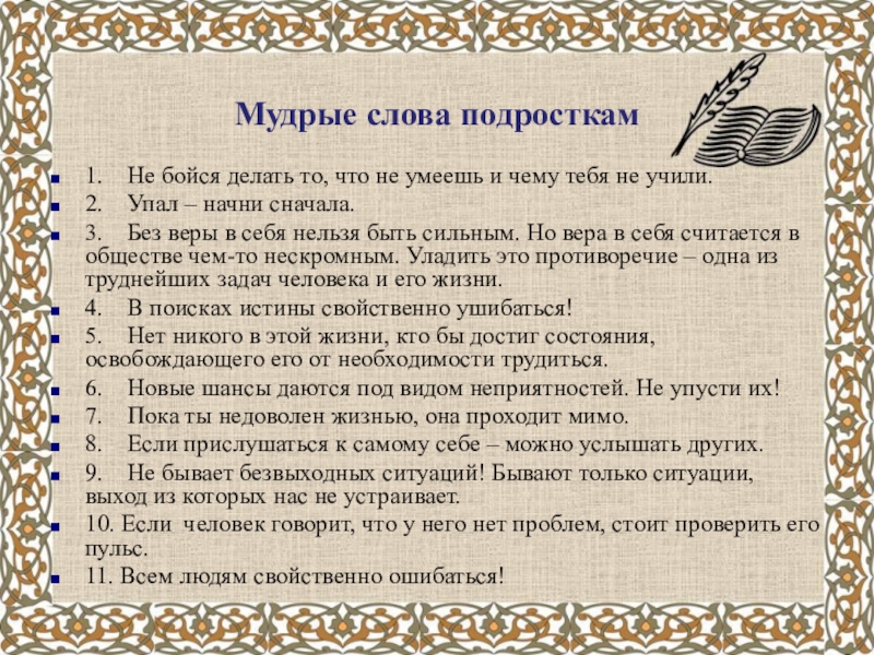 3. Без веры в себя нельзя быть сильным. Но вера в себя считается в обществе чем-то нескромным. Уладить это противоречие – одна из труднейших задач человека и его жизни.