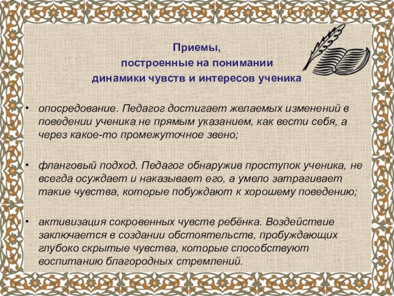 фланговый подход. Педагог обнаружив проступок ученика, не всегда осуждает и наказывает его, а умело затрагивает такие чувства, которые побуждают к хорошему поведению;