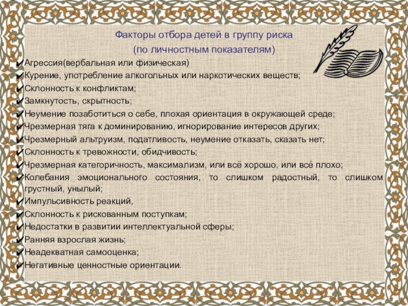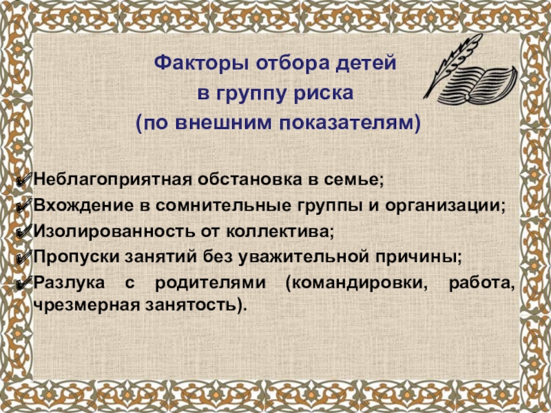 Неблагоприятная микросоциальная среда, отсутствие воспитания ребенка дома (семья с активной аморальной направленностью, семьи с низким воспитательным потенциалом, неправильные воспитательные позиции матери или отца).