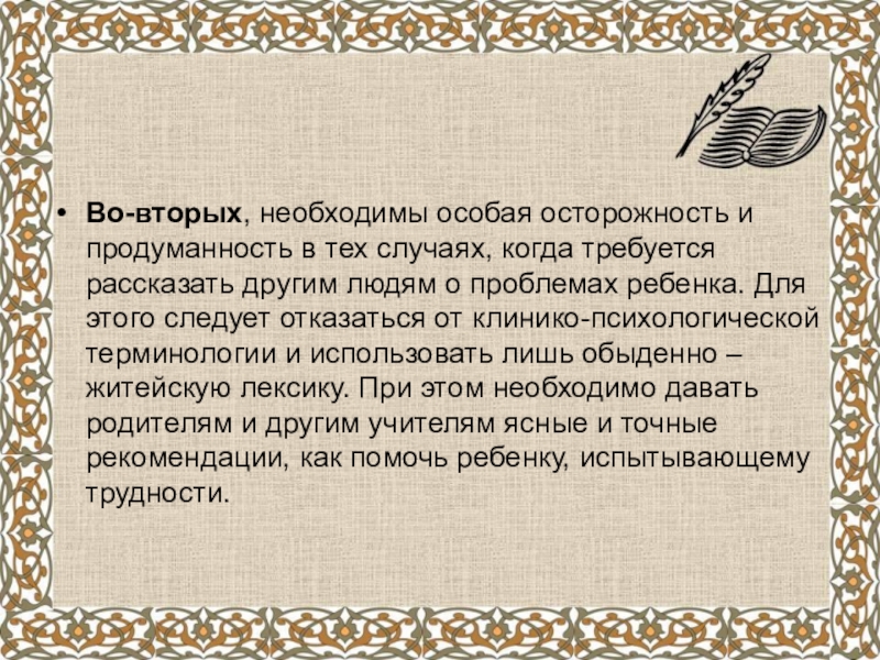 рассказать другим людям о проблемах ребенка. Для этого следует отказаться от клинико-психологической терминологии и использовать лишь обыденно – житейскую лексику. При этом необходимо давать родителям и другим учителям ясные и точные рекомендации, как помочь ребенку, испытывающему трудности.