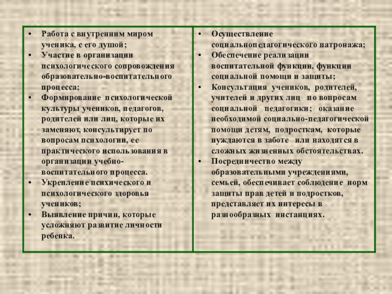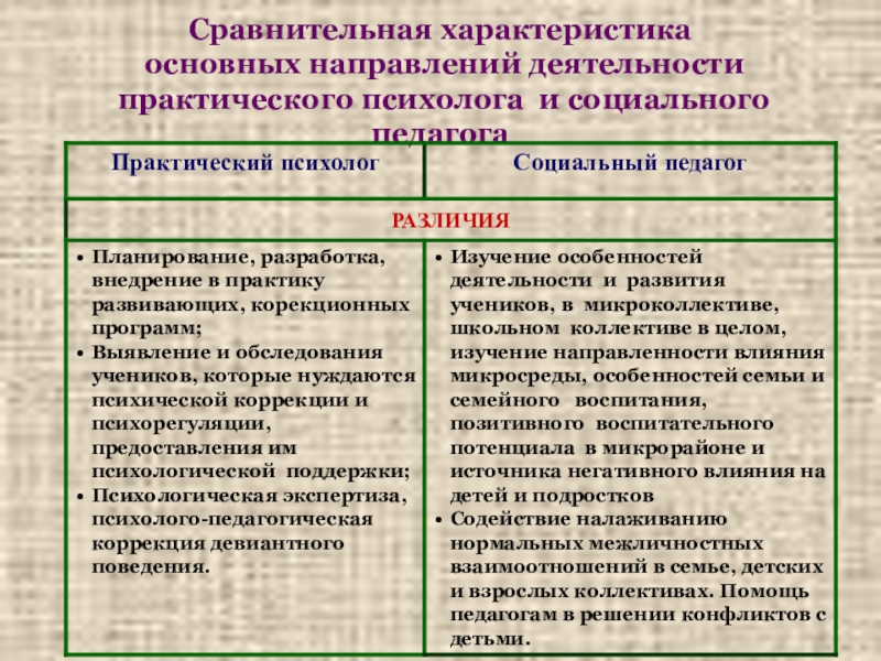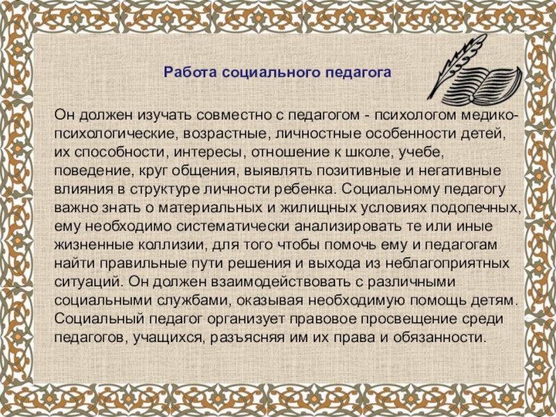 - психологом медико-психологические, возрастные, личностные особенности детей, их способности, интересы, отношение к школе, учебе, поведение, круг общения, выявлять позитивные и негативные влияния в структуре личности ребенка. Социальному педагогу важно знать о материальных и жилищных условиях подопечных, ему необходимо систематически анализировать те или иные жизненные коллизии, для того чтобы помочь ему и педагогам найти правильные пути решения и выхода из неблагоприятных ситуаций. Он должен взаимодействовать с различными социальными службами, оказывая необходимую помощь детям. Социальный педагог организует правовое просвещение среди педагогов, учащихся, разъясняя им их права и обязанности.