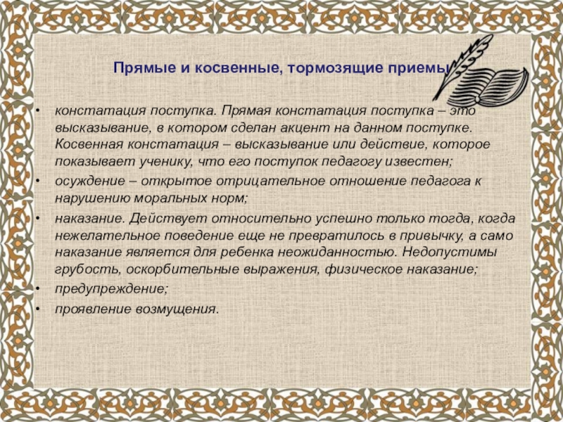 высказывание, в котором сделан акцент на данном поступке. Косвенная констатация – высказывание или действие, которое показывает ученику, что его поступок педагогу известен;