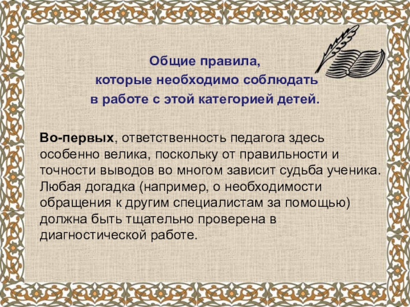 Во-первых, ответственность педагога здесь особенно велика, поскольку от правильности и точности выводов во многом зависит судьба ученика. Любая догадка (например, о необходимости обращения к другим специалистам за помощью) должна быть тщательно проверена в диагностической работе.