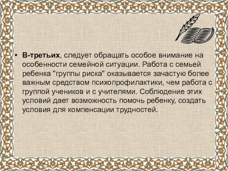 В-третьих, следует обращать особое внимание на особенности семейной ситуации. Работа с