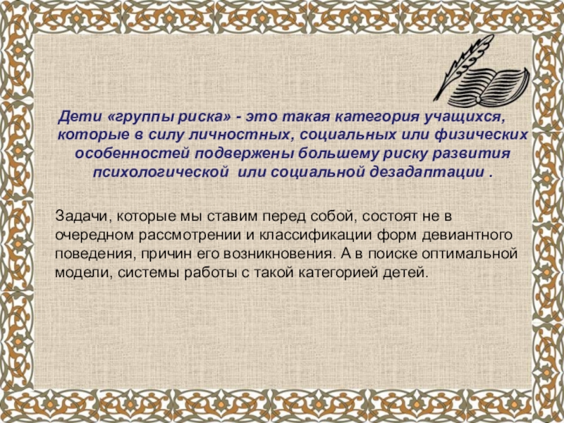 Дети «группы риска» - это такая категория учащихся, которые в силу личностных, социальных