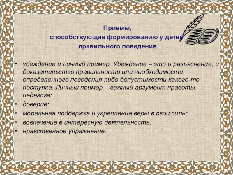 – это и разъяснение, и доказательство правильности или необходимости определенного поведения либо допустимости какого-то поступка. Личный пример – важный аргумент правоты педагога;