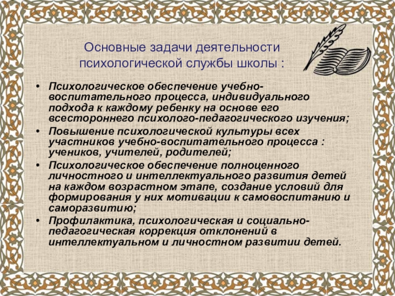 Слайд 4Основные задачи деятельности психологической службы школы :