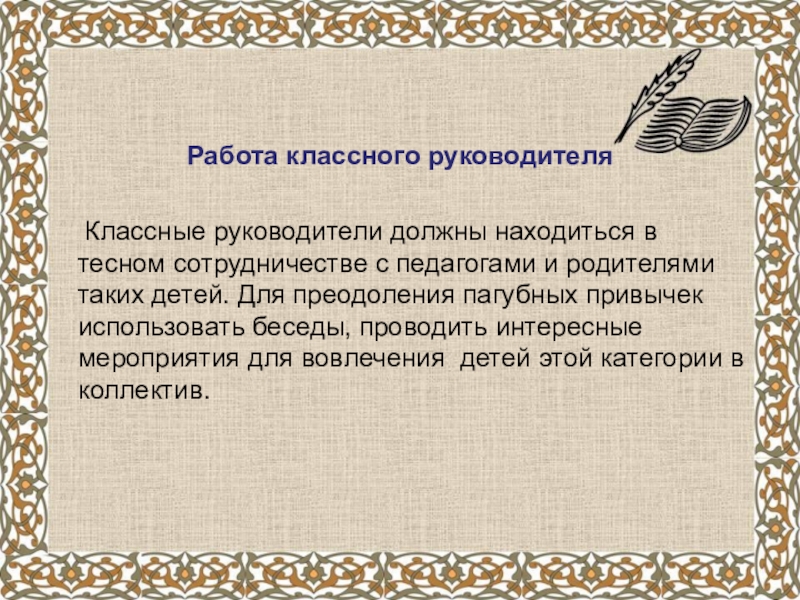 сотрудничестве с педагогами и родителями таких детей. Для преодоления пагубных привычек использовать беседы, проводить интересные мероприятия для вовлечения детей этой категории в коллектив.