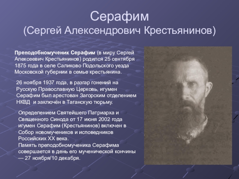 Память преподобномученика Серафима совершается в день его мученической кончины — 27 ноября/10 декабря.
