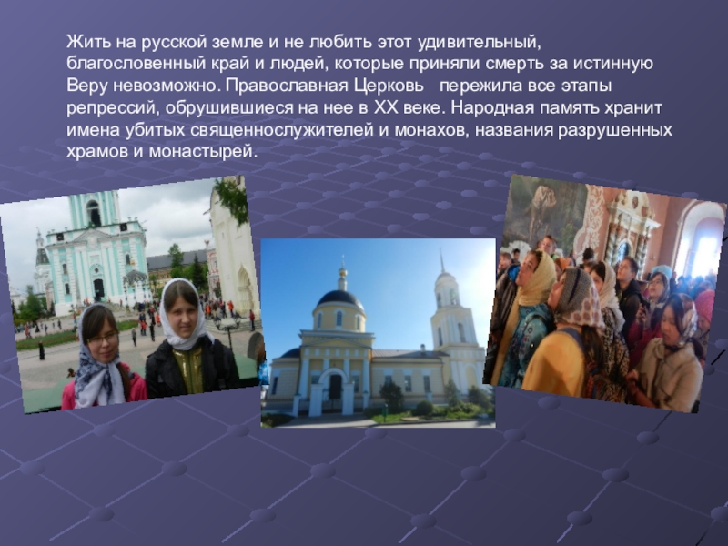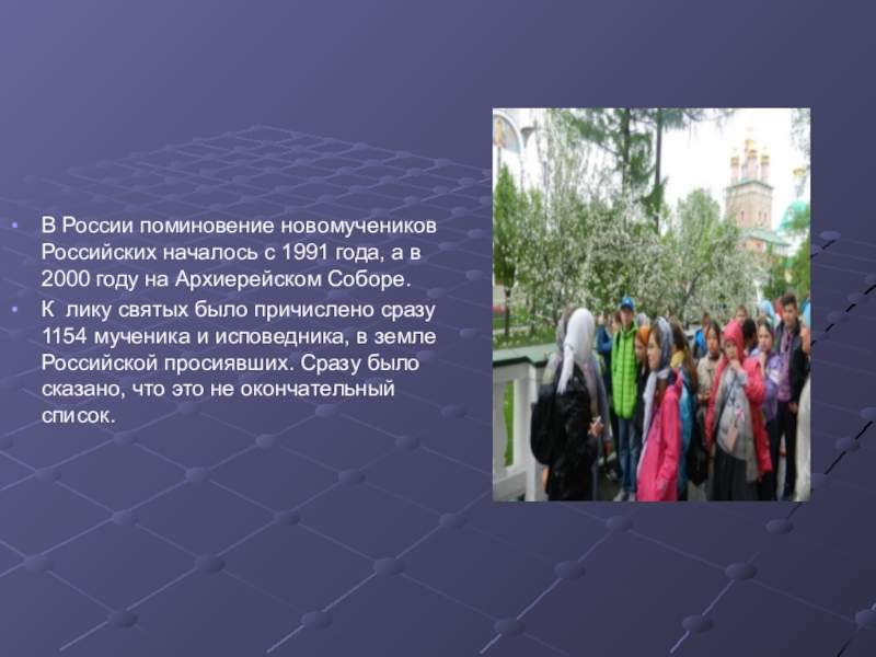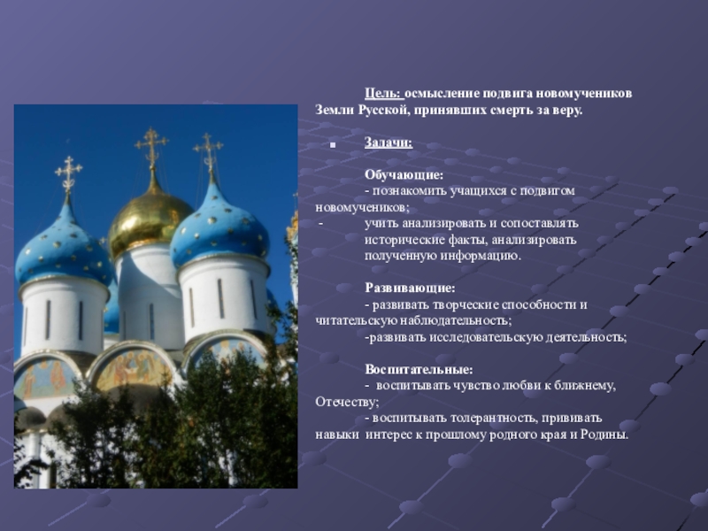 Цель: осмысление подвига новомучеников Земли Русской, принявших смерть за веру.